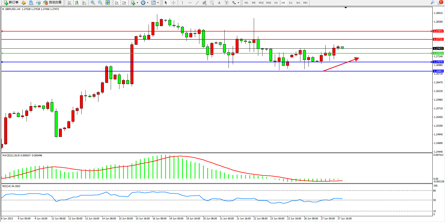 英镑美元GBPUSD ——4小时K线图显示: