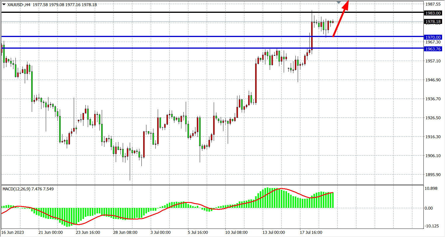 4小时图看,黄金在1970-1983间走整理,MACD量能维持在零轴上,支撑关注1963-1970附近,上方阻力1983-2000。