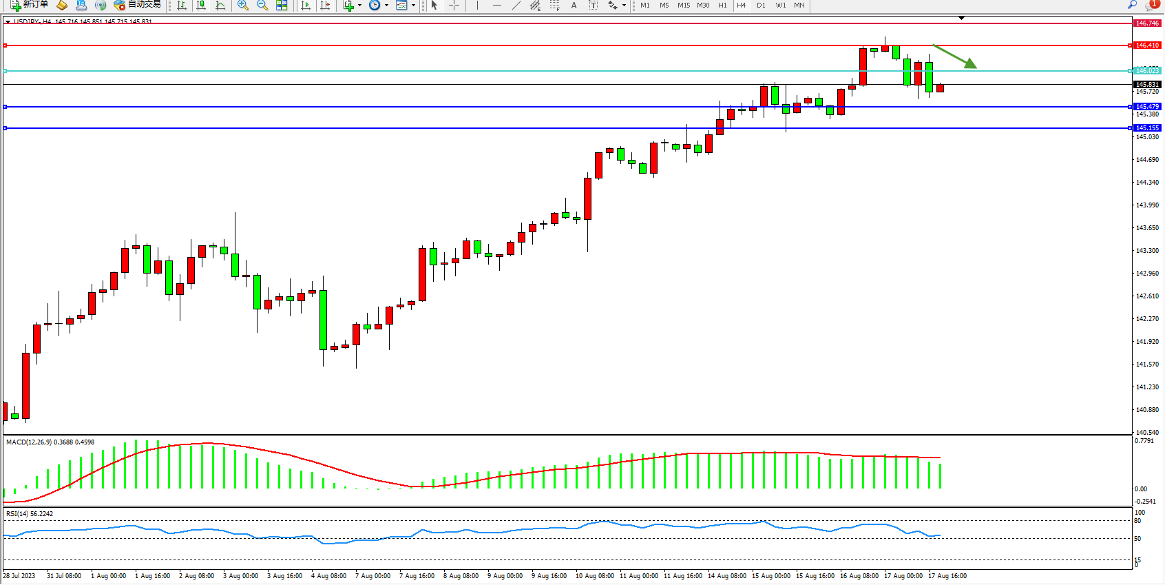 交易策略:146.023下方看跌,目标145.479  145.155