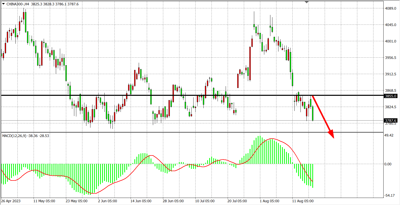 4小时图看,沪深300反弹至3855再度回落走低,MACD量能在零轴下走强,压力继续关注3855附近,下方支撑关注3800-3770一线。