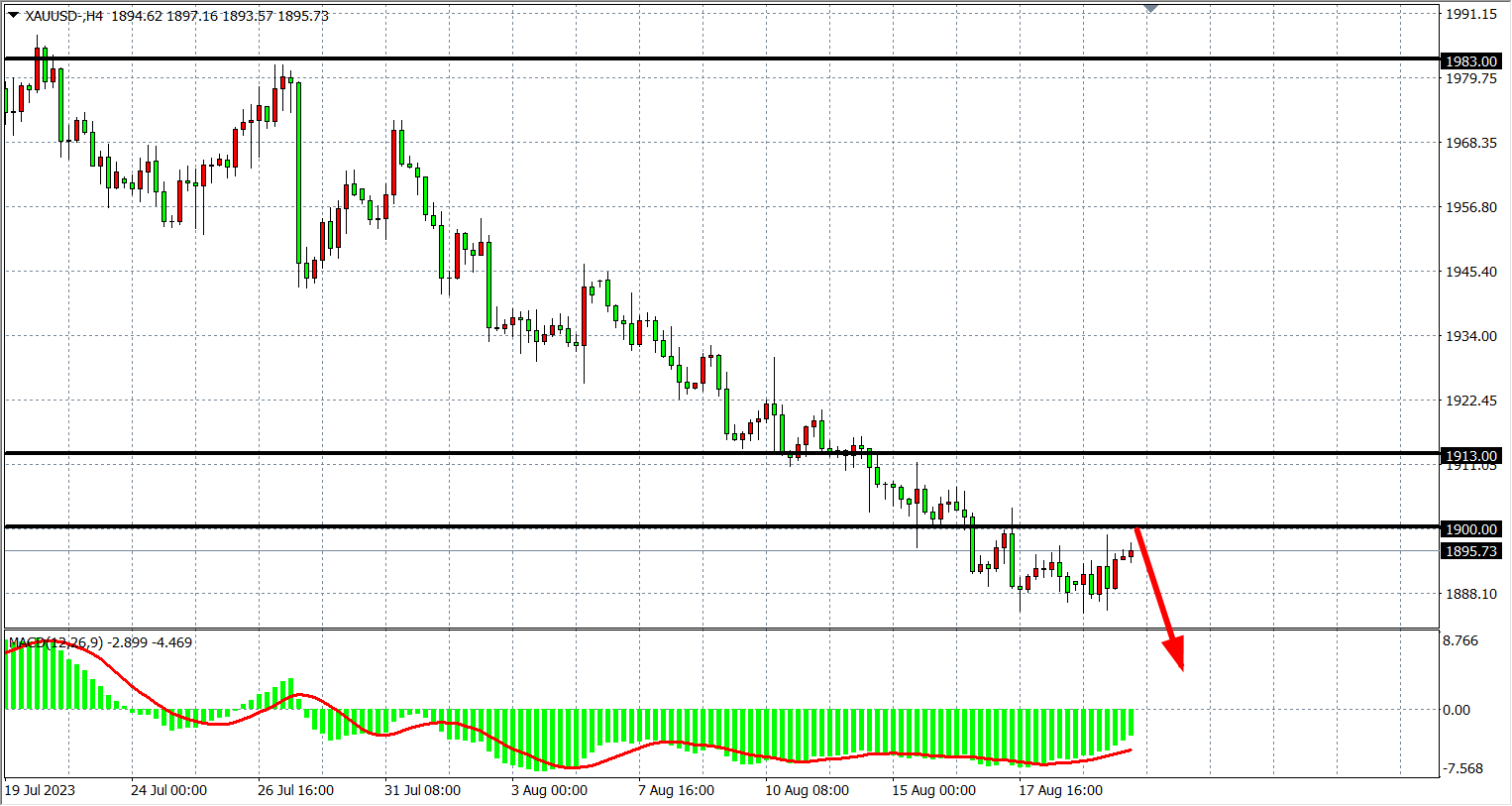 4小时图看,黄金维持在1900关口之下,MACD量能延续零轴下持续均匀放量,走势维持空头行情,阻力继续关注1900-1913附近,支撑关注下方1880-1860。