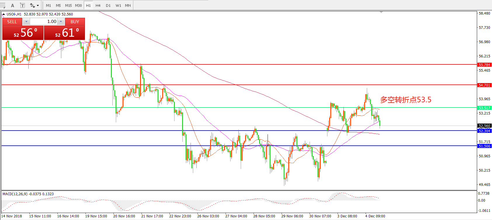 小时图看,油价受G20利好消息影响,跳空高后出现回落,形态上有形成双头走势迹象,短期均线走平,MACD红柱缩短,短期关注下方支撑52.3一线。