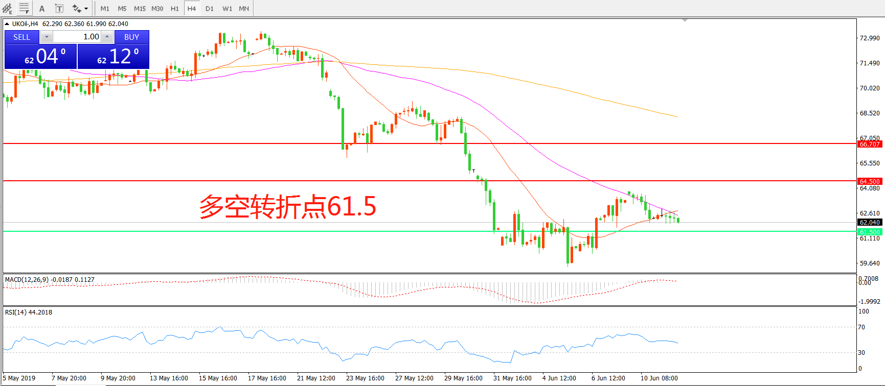 4小时图看,油价触碰55周期均线后震荡回落,短期走势偏空,MACD绿柱减少,均线系统有形成金叉迹象,MACD绿柱减少,RSI指标走平,日内仍重点关注61.5附近得失。
