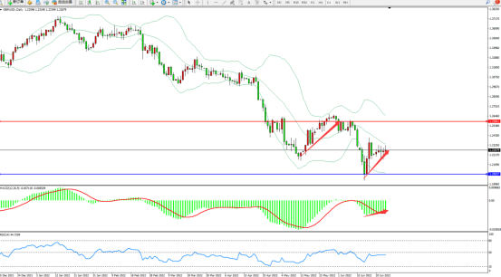 空头动力呈阶梯式震荡下行,低位跌破布林带指标下轨附近节点后反转震荡上移,即将触及布林带指标中轨附近节点后开始整理,上方压制关注1.25841附近,低位支撑关注1.20037附近节点,布林带指标呈收口走势中,MACD指标处于空头区域维持整理平移,RSI指标处于50均衡线下侧弱势徘徊中,如图: