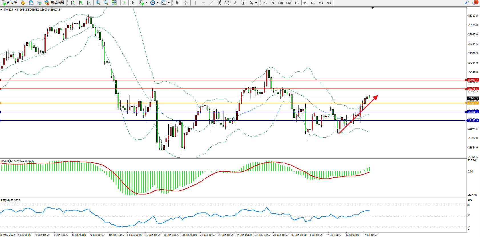 日经指数JPN225——4小时K线图显示:
