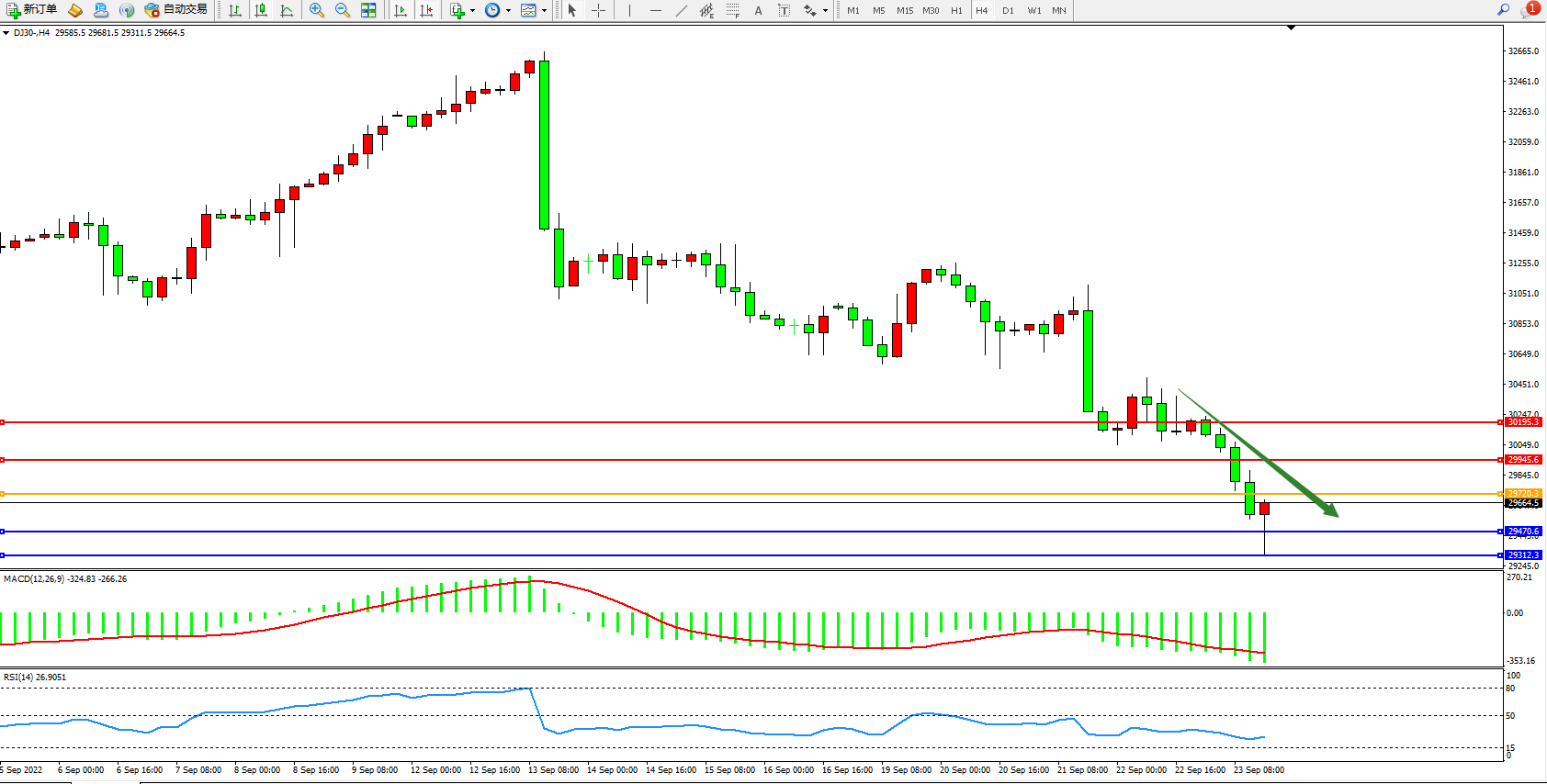 道琼斯指数9月23日(周五)收盘下跌483.83点,跌幅1.61%,报29592.85点;美国9月份制造业和服务业产出均出现下滑,但与8月份相比,这两项产出的萎缩幅度均有所放缓,尤其是服务业,订单量恢复温和增长,缓解了人们对当前经济低迷程度的一些担忧。