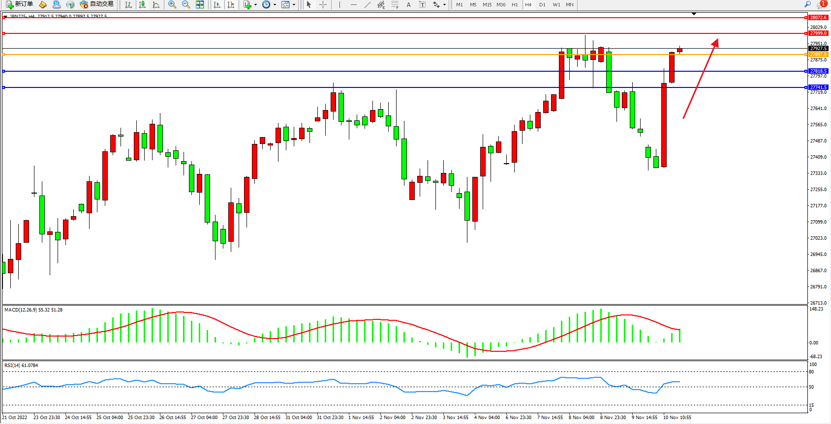 日经指数JPN225——4小时K线图显示: