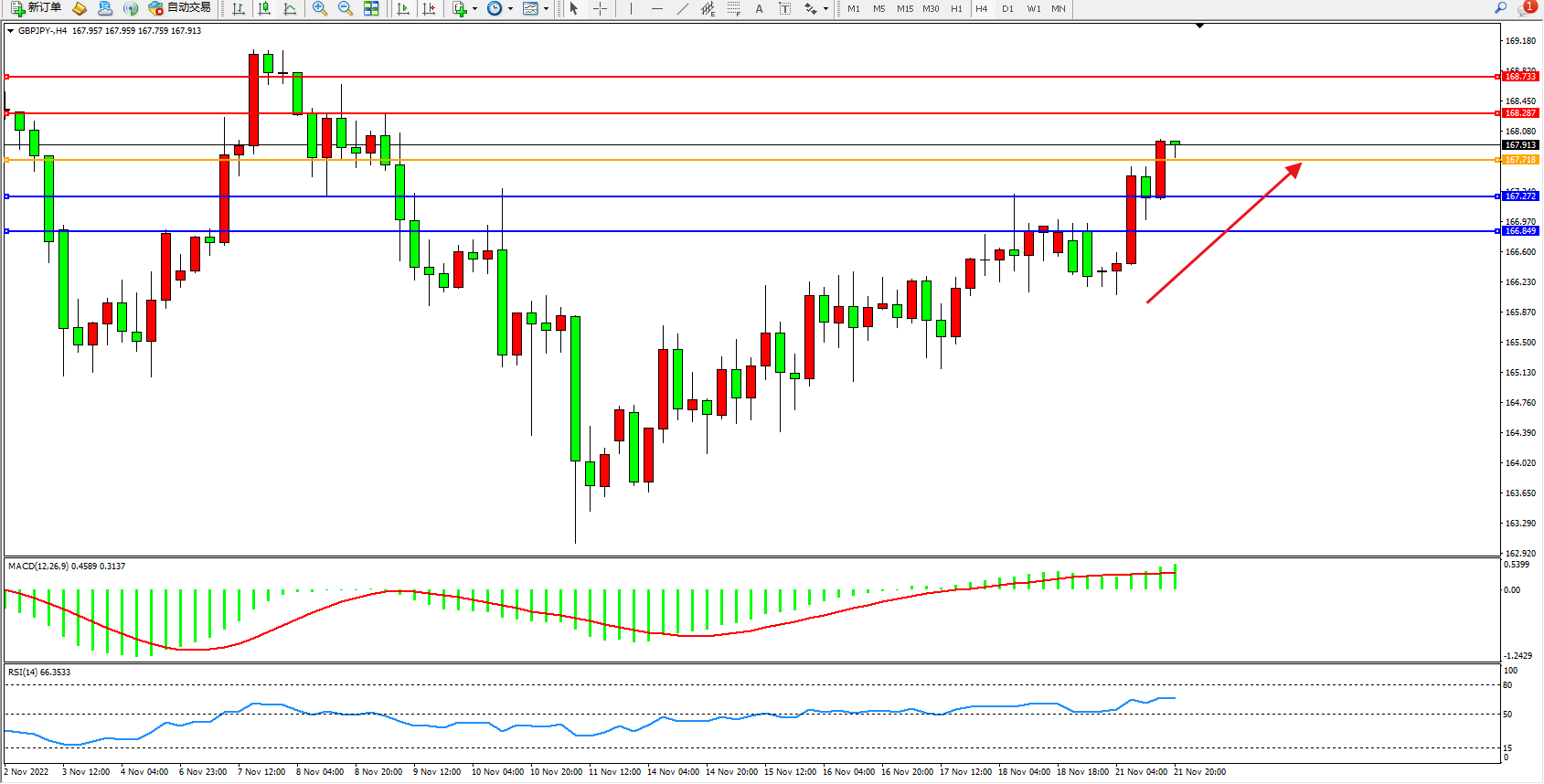 交易策略:167.718上方看涨,目标168.287、168.733