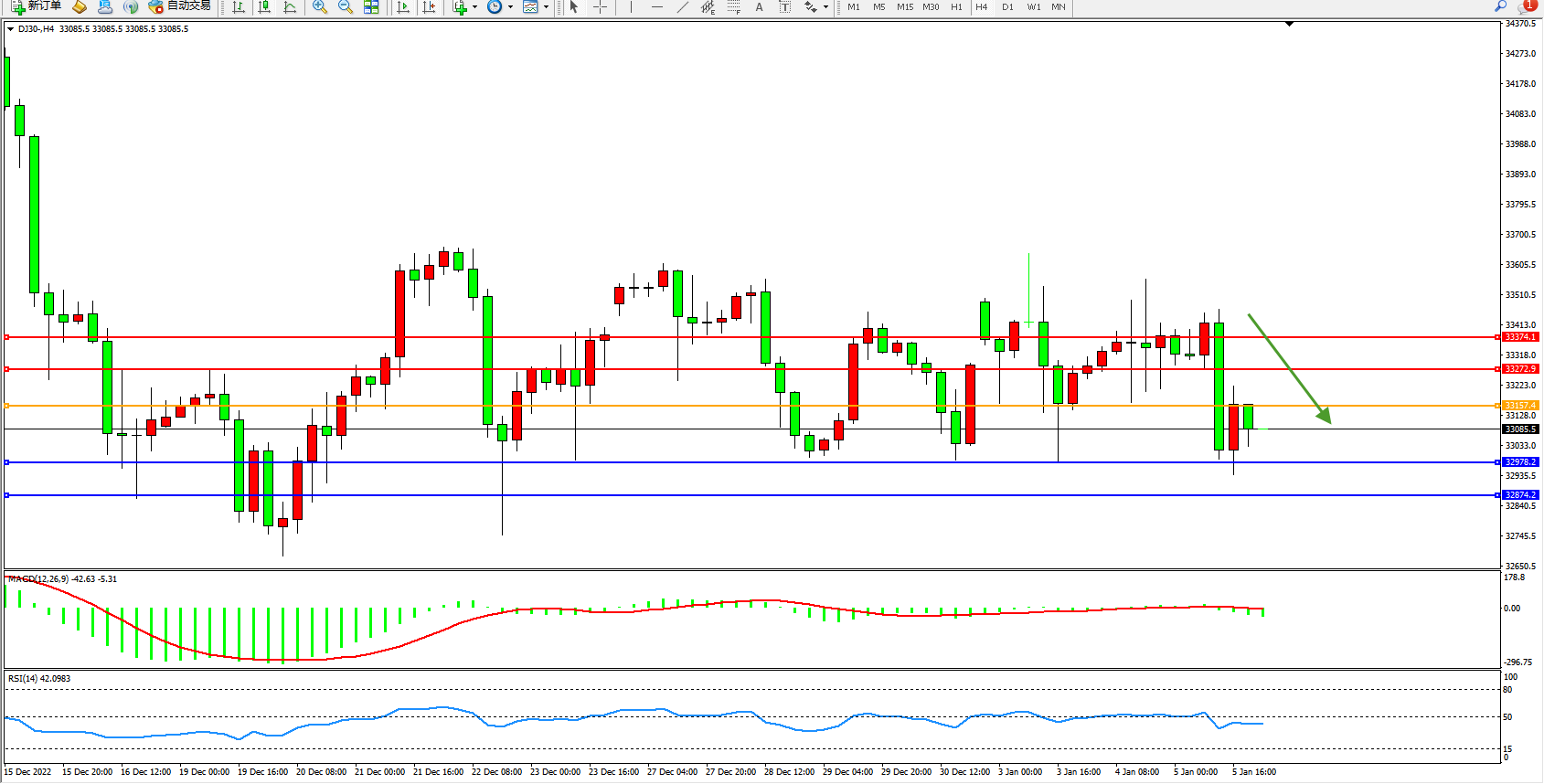 道琼斯指数DJ30——4小时K线图显示: