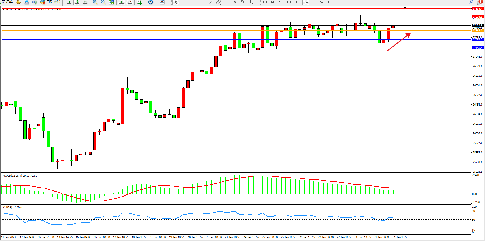日经指数JPN225——4小时K线图显示: