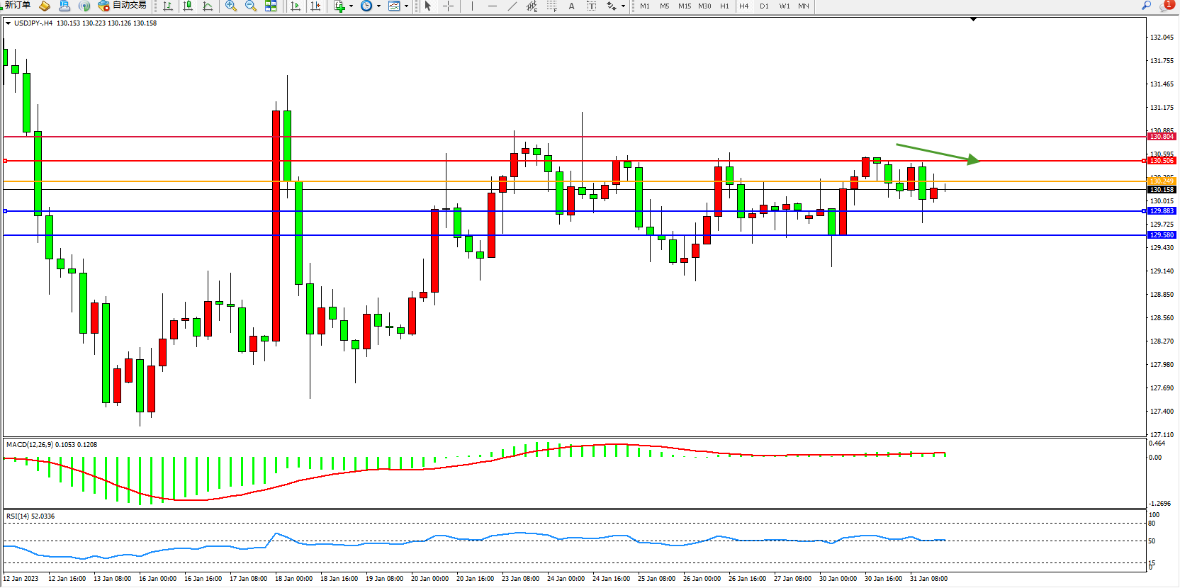 备选策略:130.249上方看涨,目标130.506、130.804